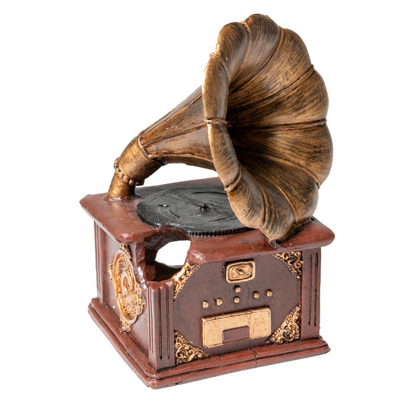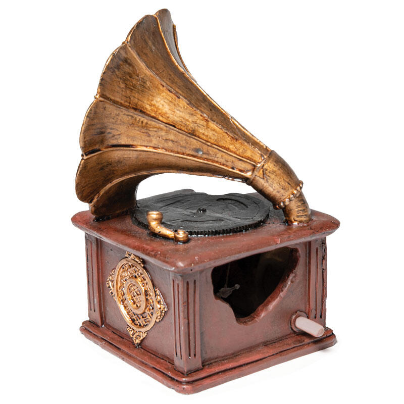 Стилизованный под граммофон, такой грот может быть использован как самостоятельный элемент декора - для оформления небольшого аквариума, так и в комплекте с другими гротами, объемными фонами и искусственными растениями - для оформления аквариума большого объема.