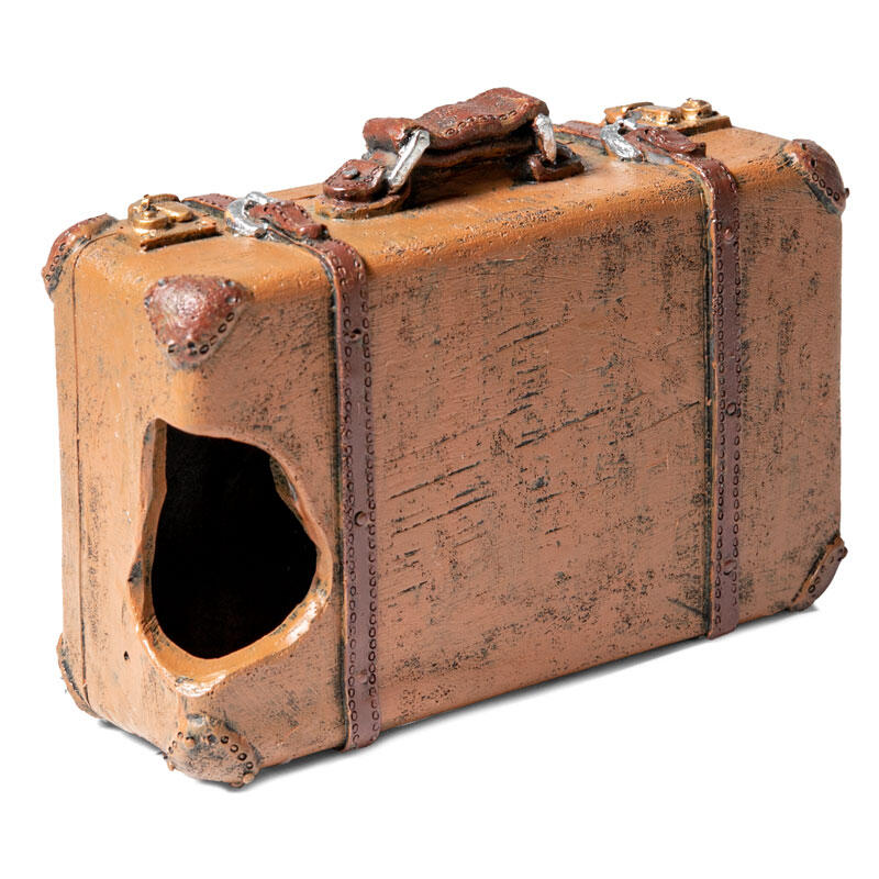 Стилизованный под винтажный чемодан, такой грот может быть использован как самостоятельный элемент декора - для оформления небольшого аквариума, так и в комплекте с другими гротами, объемными фонами и искусственными растениями - для оформления аквариума большого объема.