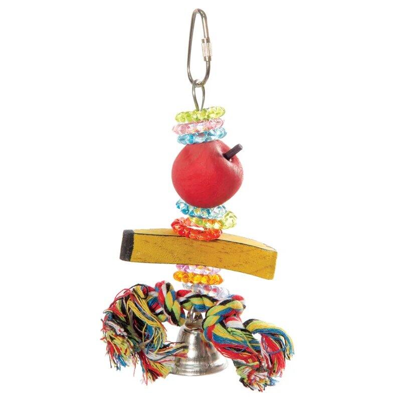 Игрушка для птиц, состоящая из деревянных фруктов и пластиковых колец, с веревкой на конце, которую так любят теребить пернатые питомцы.