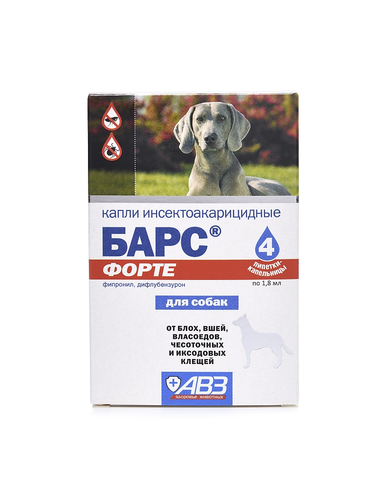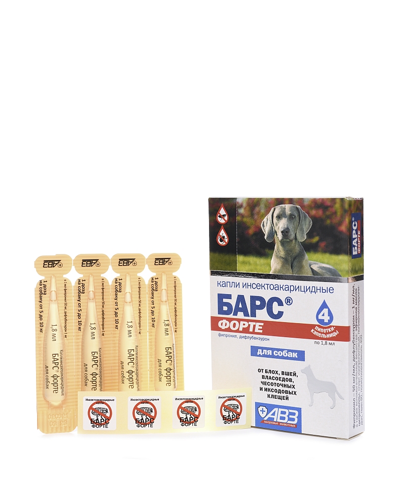 Показания к применению: Капли инсектоакарицидные Барс форте назначают собакам с 8-недельного возраста с лечебной и профилактической целью при энтомозах, вызванных вшами, блохами, власоедами, саркоптозе и нотоэдрозе (чесотка), поражении иксодовыми клещами, а также для предотвращения нападения эктопаразитов на животных.