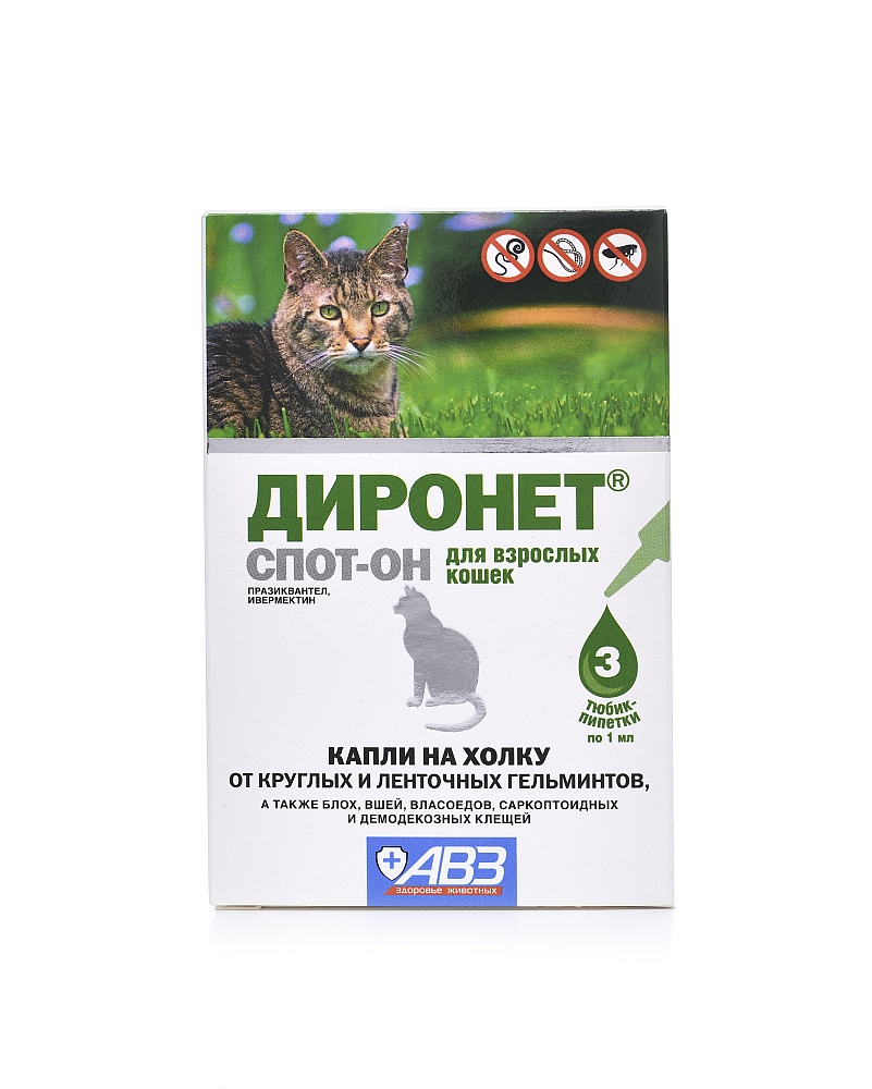 Противопоказания: Противопоказанием к применению препарата ДИРОНЕТ® спот-он является повышенная индивидуальная чувствительность животного к компонентам препарата. Запрещается применять котятам моложе 2-месячного возраста, беременным и лактирующим самкам, больным инфекционными болезнями, ослабленным и выздоравливающим животным.