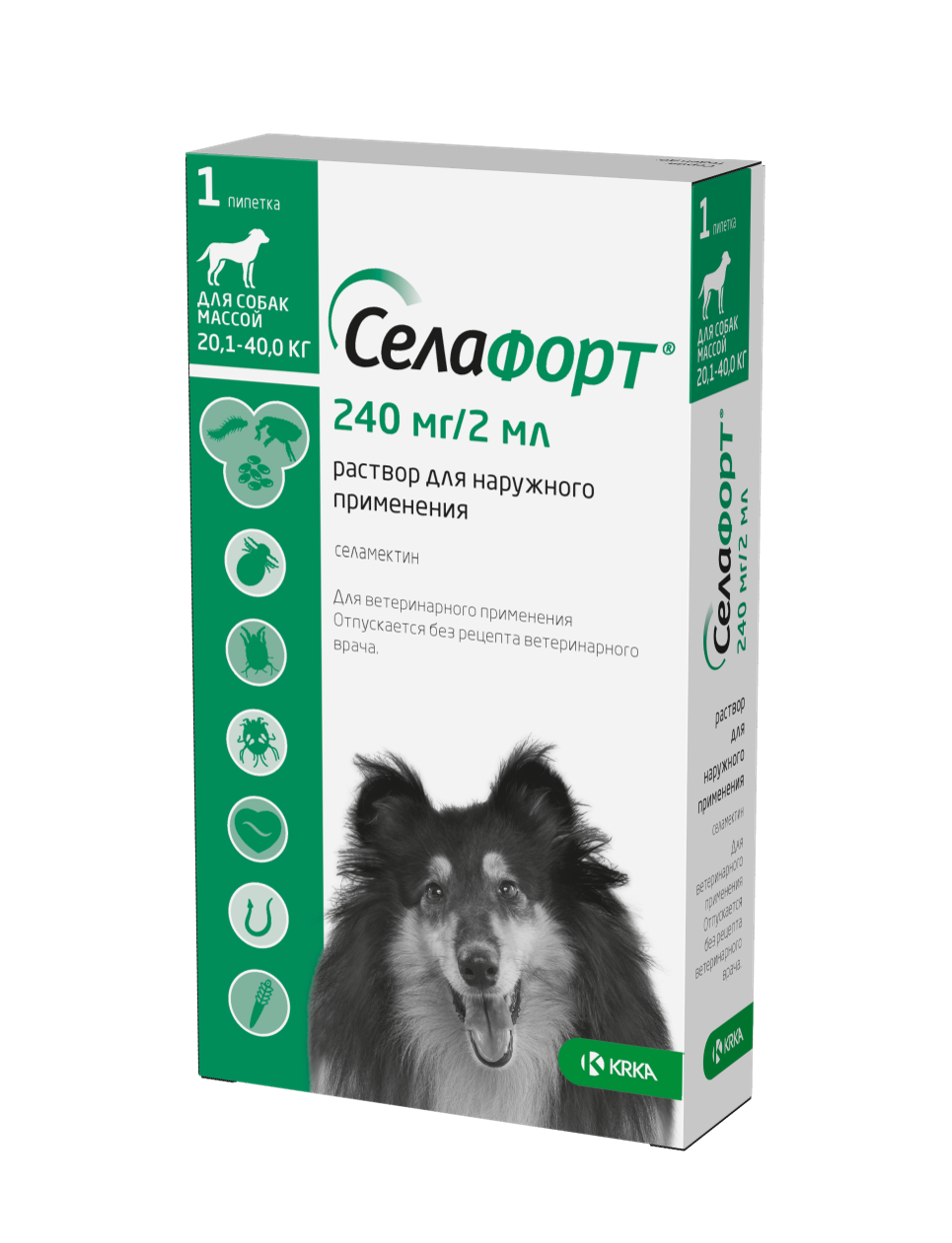 Главная Каталог Ветаптека Комплекс от всех паразитов Капли на холку Селафорт KRKA от блох, клещей, глистов, а также при болезнях ушей и кожи для собак 20,1-40кг, 1штх240мг/2мл