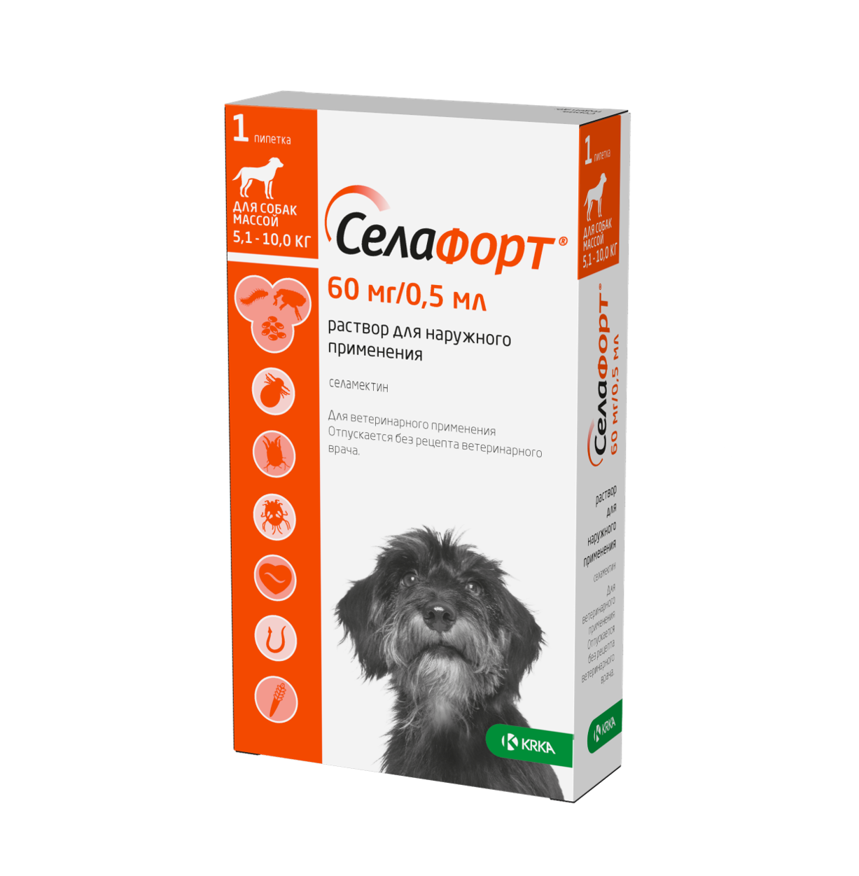 Капли на холку Селафорт KRKA от блох, клещей, глистов, а также при болезнях ушей и кожи для собак 5,1 - 10кг, 1шт*60мг/0,5мл