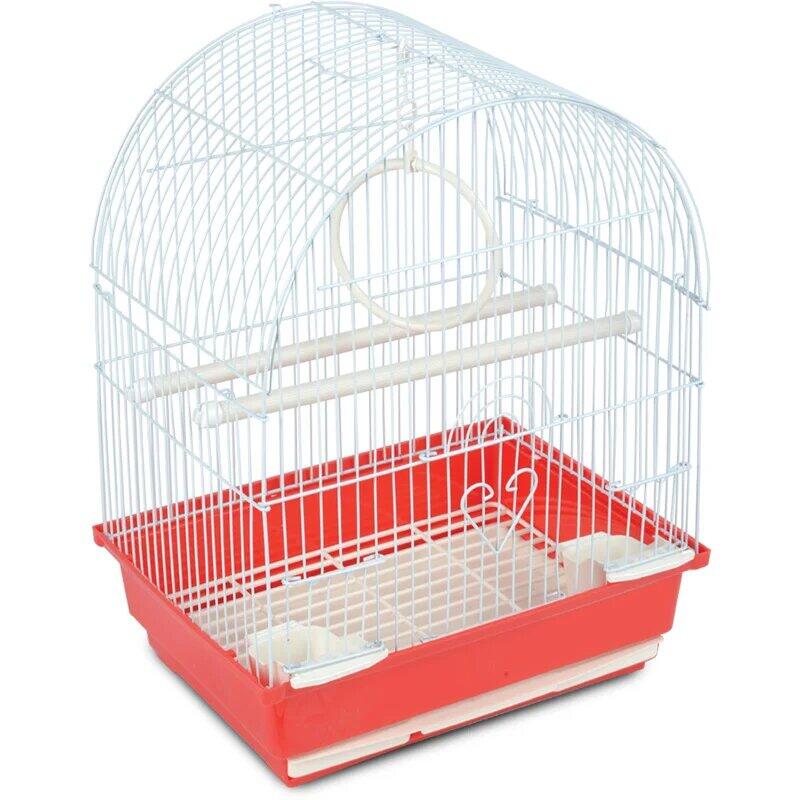 Клетка для птиц с полукруглой крышей. В комплектацию изделия входят 2 кормушки-поилки, 2 жердочки и качели. Эмалированная клетка также оборудована удобной ручкой для переноски и специальным пластиковым наружным поддоном, облегчающим процесс уборки.