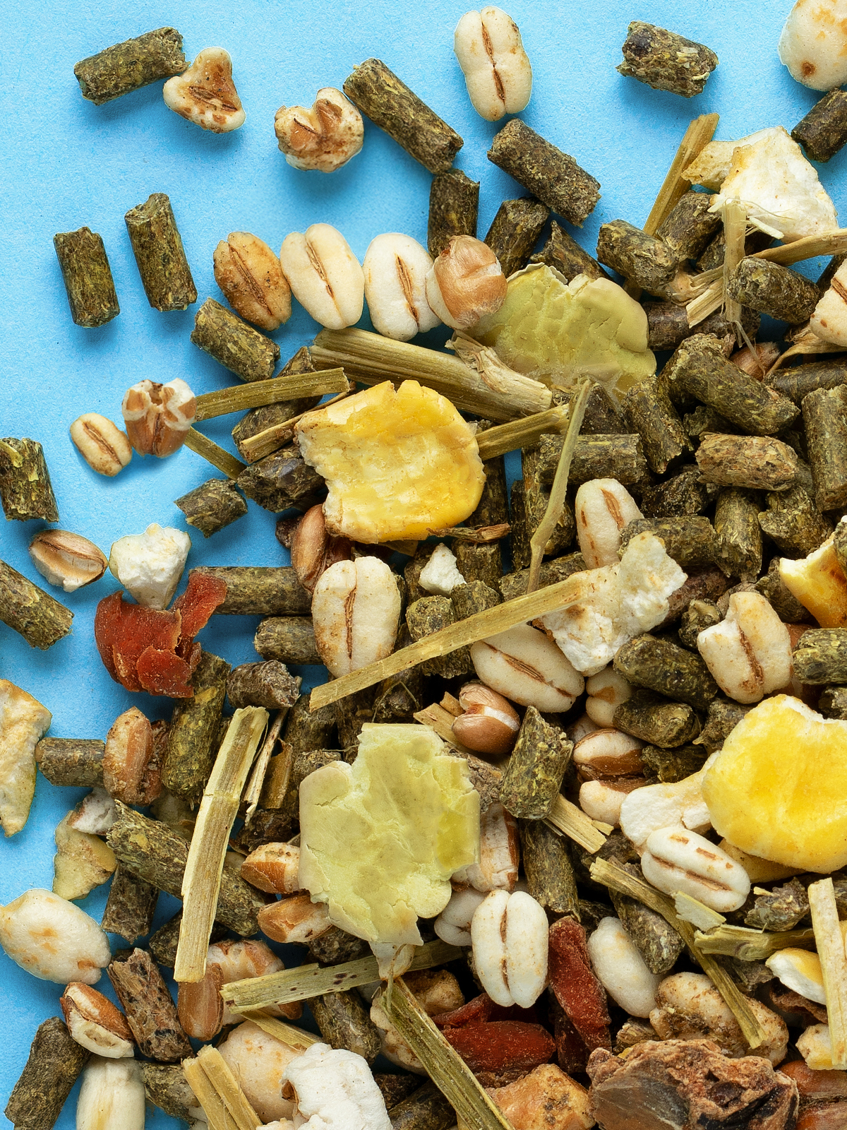 Ингредиенты: травяные гранулы, плоды рожкового дерева (кэроб), пшеница воздушная, кукуруза воздушная, ячмень воздушный, горох плющеный, хлопья кукурузные, морковь сушеная, гранулы подсолнечные, люцерна сушеная, фруктоолигосахариды, экстракт Юкки.