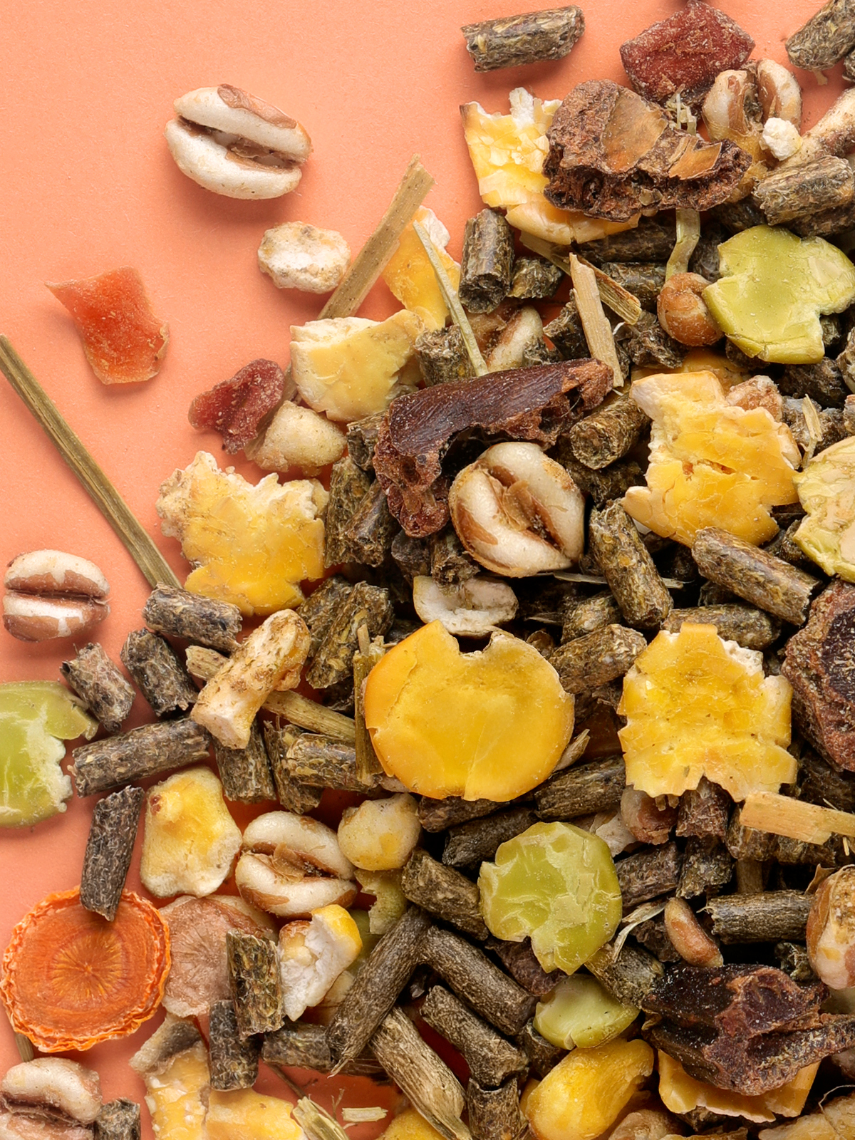 Ингредиенты: травяные гранулы, пшеница воздушная, хлопья кукурузные, плоды рожкового дерева (кэроб), кукуруза воздушная, люпин сладкий плющеный, горох плющеный, морковь сушеная, люцерна сушеная, фруктоолигосахариды, экстракт Орегано, экстракт Юкки.