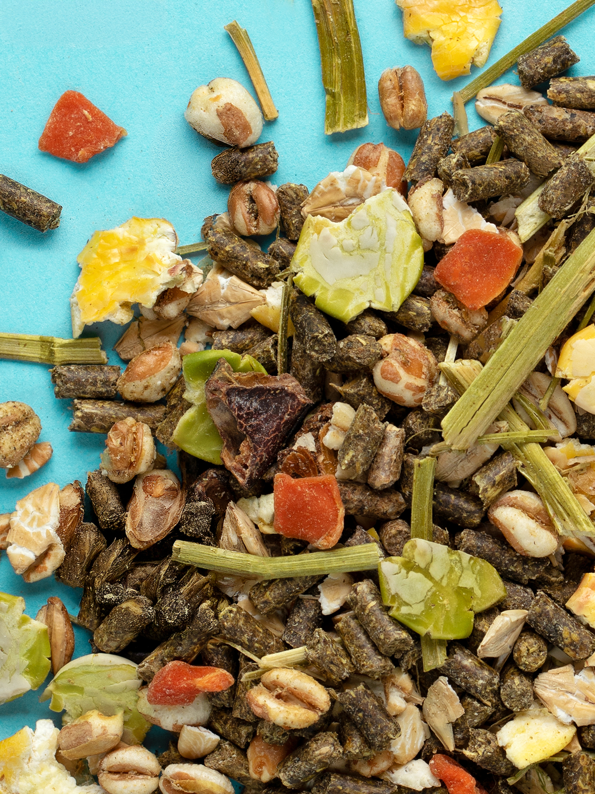 Ингредиенты: травяные гранулы, пшеница воздушная, ячмень плющеный, ячмень воздушный, плоды рожкового дерева (кэроб), овес плющеный, кукуруза воздушная, горох плющеный, хлопья кукурузные, люпин сладкий плющеный, морковь сушеная, люцерна сушеная, семена подсолнечника, фруктоолигосахариды, экстракт Юкки.