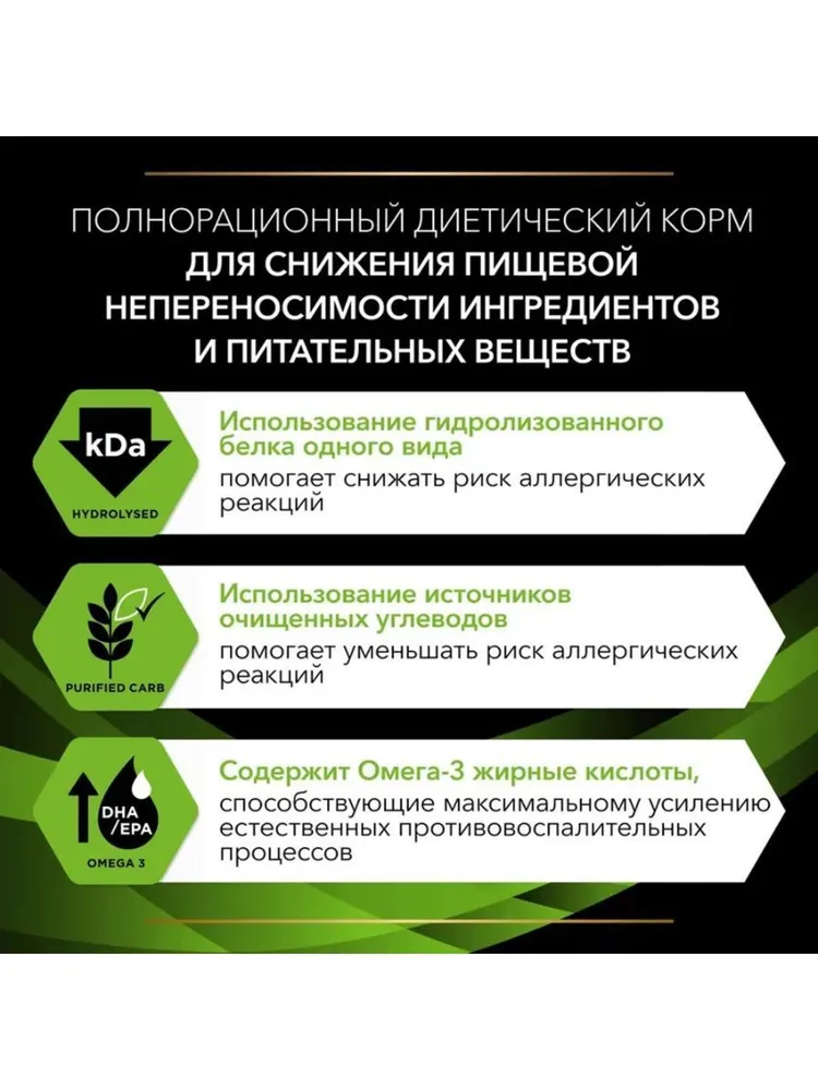 Сухой корм для собак PURINA PRO PLAN Veterinary Diets НА Hypoallergenic ‒ полнорационный диетический корм для щенков и взрослых собак для снижения пищевой непереносимости ингредиентов и питательных веществ, с гидролизованным белком и отборными источниками углеводов. Подходит для собак всех пород. Использование данного корма рекомендовано под наблюдением ветеринарного врача.