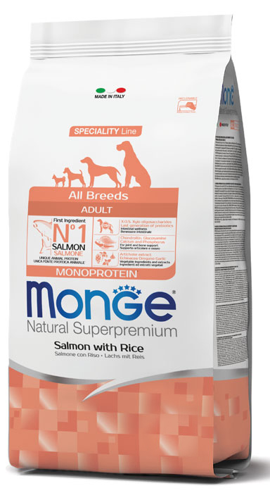 Monge Natural Superpremium All breeds Adult Monoprotein* Salmon with Rice — полнорационный корм для взрослых собак всех размеров. Специально разработан для благополучия вашей собаки благодаря исследованиям, проведенным в Италии, в области высококачественных питательных веществ.