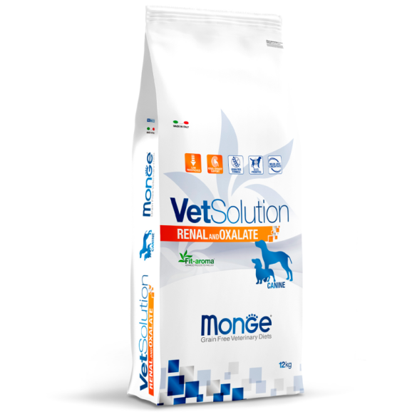 MONGE VETSOLUTION RENAL and OXALATE — полнорационный сухой диетический корм из курицы для собак «RENAL» для поддержания функции почек у собак при острой или хронической почечной недостаточности. Он также разработан для снижения образования оксалатных камней. Содержит концентрат сока дыни для нейтрализации свободных радикалов, зеленый чай для поддержки почек, ксилоолигосахариды для кишечной микробиоты. Формулу отличает пониженный уровень высококачественного белка, сниженное содержание фосфора и сырого белка, низкие уровни кальция, витамина D и подщелачивающий мочу состав.