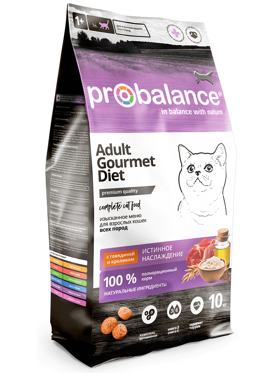 Как известно, многие кошки избирательны в еде и часто отвергают предложенную пищу. Рецепторы кошек чутко воспринимают различный вкус мяса. Датские ветеринары выяснили, что это не единственная причина привередливости кошек. Еще имеет значение баланс питательных веществ. На основе научных исследований создан корм Probalance "Gourmet Diet Beef & Rabbit" (Пробаланс "Гурме Дайет Эдалт Биф энд Раббит"). Он состоит из 100% натуральных ингредиентов, основа корма – два вида мяса (говядина и кролик). В корме нет курицы, поэтому рацион подойдет кошкам с аллергией на этот вид мяса.