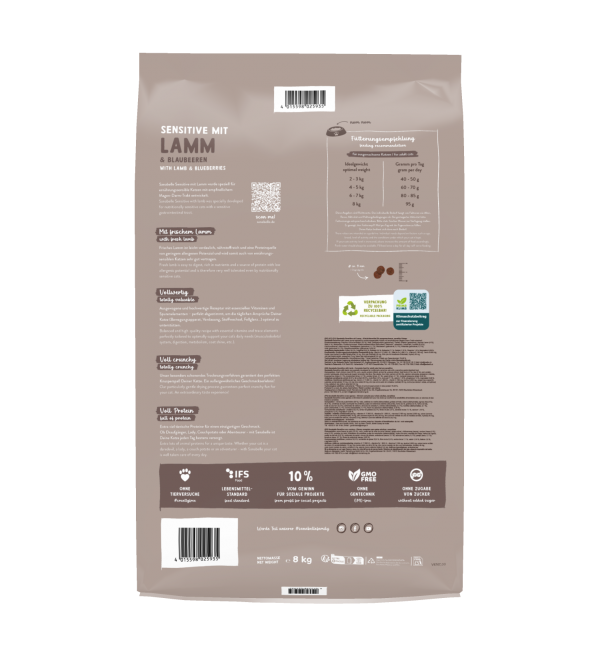 Состав: свежее мясо курицы (20 %), кукуруза, белок из птицы (сушеный), животный жир, шкварки (сушеные), свежий ягненок (4 %), рис (4 %), кукурузный белок, белковый гидролизат, сушеный свекольный жом (обессахаренный), рисовая мука, семена льна, мука, масло лосося (0,5 %), карбонат кальция, хлорид калия, ягоды брусники (сушеные, 0,1 %), ягоды голубики (сушеные, 0,1 %), петрушка (сушеная, 0,1 %), дрожжи (сушеные, 0,1 %), цветы календулы (сушеные, 0,05 %).