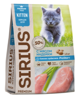 SIRIUS — сухой корм премиум класса для полноценного ежедневного рациона котят с 1-2-х месяцев до 1 года. Высокое содержание мясных ингредиентов обеспечивает оптимальный уровень белка и укрепляет мышцы. Баланс витаминов и комплекса пробиотиков 4-го поколения PROSTOR+ нормализует пищеварение и укрепляет иммунитет. Омега 3 и Омега 6 способствуют поддержанию здоровья сердца, мозга, нервной системы, здоровья кожи и красоты шерсти. Специально подобранный размер гранулы для котят.