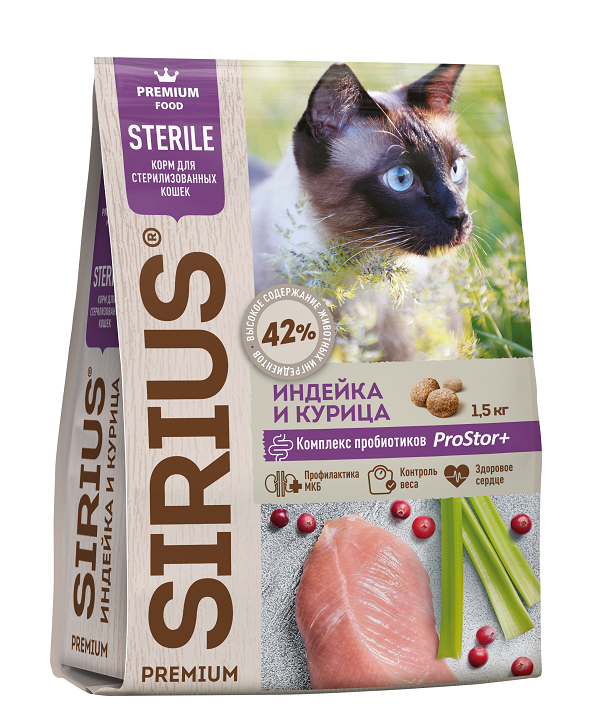 SIRIUS — сухой корм премиум класса для полноценного ежедневного рациона стерилизованных кошек. Высокое содержание мясных ингредиентов обеспечивает оптимальный уровень белка и укрепляет мышцы. Пониженное содержание жиров для контроля веса. Баланс витаминов и комплекса пробиотиков 4-го поколения PROSTOR+ нормализует пищеварение и укрепляет иммунитет. Омега 3 и Омега 6 способствуют поддержанию здоровья сердца, мозга, нервной системы, здоровья кожи и красоты шерсти. Корм способствует профилактике мочекаменной болезни.