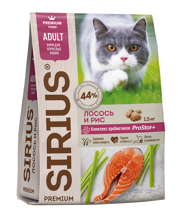 SIRIUS — сухой корм премиум класса для полноценного ежедневного рациона взрослых кошек. Высокое содержание мясных ингредиентов обеспечивает оптимальный уровень белка и укрепляет мышцы. Баланс витаминов и комплекса пробиотиков 4-го поколения PROSTOR+ нормализует пищеварение и укрепляет иммунитет. Омега 3 и Омега 6 способствуют поддержанию здоровья сердца, мозга, нервной системы, здоровья кожи и красоты шерсти.