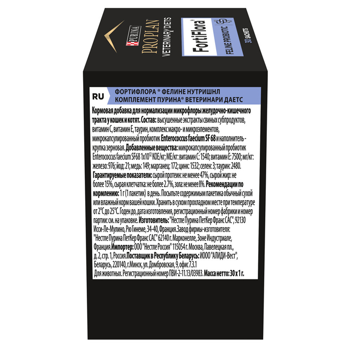 Применение: Используйте 1 пакетик FortiFlora® в сутки, можно на протяжении длительного периода. Посыпьайте содержимым пакетика обычный корм вашей кошки. Рекомендованная длительность применения – не менее одного месяца. Как только у вашего питомца нормализовался стул, продолжайте добавлять 1 пакетик FortiFlora® к его рациону на протяжении не менее еще одной недели. Для восстановления микрофлоры кишечника при лечении антибиотиками ежедневно добавляйте в корм 1 пакетик в течение одной недели после приема его последней дозы. Рекомендованная длительность применения – не менее одного месяца. Для улучшения работы иммунной системы добавляйте к рациону питомца 1 пакетик FortiFlora® в день. Рекомендованная длительность применения – не менее одного месяца.