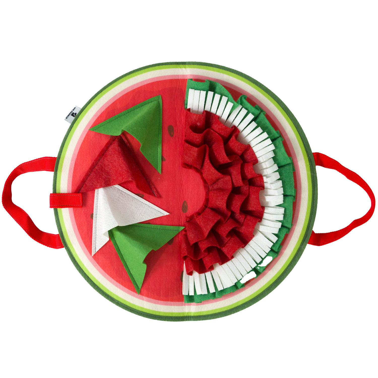 Многофункциональная игрушка для собак нюхательный коврик Арбуз. Нюхательный коврик - это уникальная развивающая игрушка, которая содержит комплекс упражнений различной сложности для развития интеллекта собаки. Выполняя упражнения, собака не просто вынюхивает любимый корм или лакомство, но и думает, как заполучить желаемую награду, что стимулирует развитие интеллектуальной деятельности. Способствует решению проблем с ЖКТ, а также выполняет функции анти-стресс игрушки. Коврик-сумка выполнен в практичном виде с удобными ручками. Вы можете взять коврик с собой в путешествие или на пикник за городом, чтобы ваш питомец мог проводить время с пользой и весельем. Произведено с использованием гипоаллергенных материалов. Уход: ручная стирка при температуре 40°С.