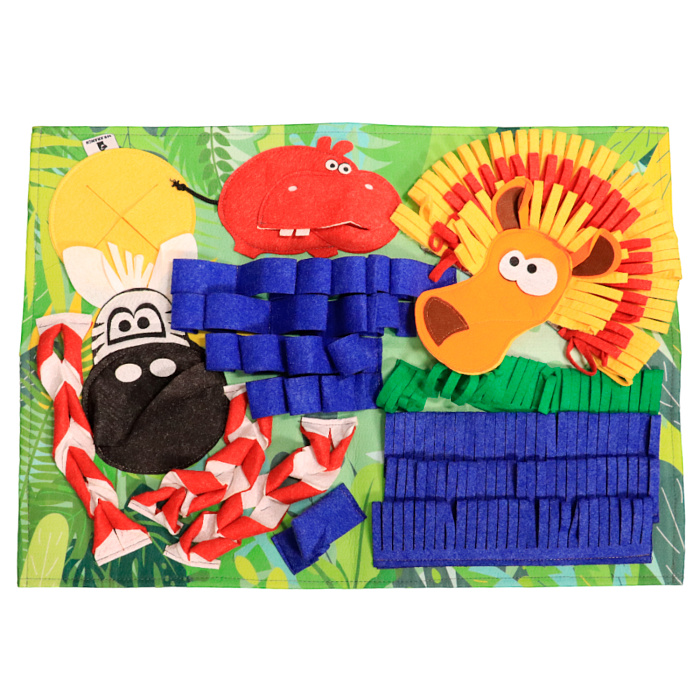 Многофункциональная игрушка для собак нюхательный коврик «Африка New». Нюхательный коврик - это уникальная развивающая игрушка, которая содержит комплекс упражнений различной сложности для развития интеллекта собаки. Выполняя упражнения, собака не просто вынюхивает любимый корм или лакомство, но и думает, как заполучить желаемую награду, что стимулирует развитие интеллектуальной деятельности. Способствует решению проблем с ЖКТ, а также выполняет функции анти-стресс игрушки. Произведено с использованием гипоаллергенных материалов. Уход: ручная стирка при температуре 40°С.