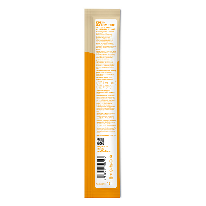 Крем-лакомство с курицей Диетическая куриная грудка Крем-лакомство «Мнямс» с курицей – это изысканное угощение с нежнейшей кремовой консистенцией. Утонченный вкус приводит кошек в восторг, а яркие эмоции довольных любимцев при кормлении с рук дарят хозяевам ощущение полного счастья. Подается как порционное угощение, или добавляется в виде аппетитного соуса к основному рациону для обогащения вкуса привычных блюд. Изготовлено по новейшей японской технологии и соответствует мировым стандартам качества.