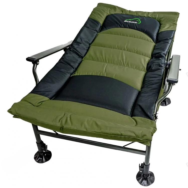 Карповое кресло Bison HBA-2021 — рыбаки оценят данную модель, так как можно отрегулировать по высоте и наклону каждую ножку. На неровных поверхностях это очень актуально. Также спинку можно регулировать по желанию, опускать до положения лёжа, и использовать кресло как раскладушку, тем более, что мягкий наполнитель создаёт приятные ощущения во время отдыха.