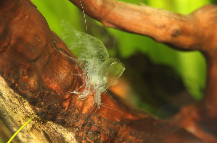 Через 2-3 недели у икринок обнаруживаются черные глазки. Из икринок сразу появляются сформированные маленькие креветки размером около 1 мм, которых очень трудно разглядеть в аквариуме, так как они обычно прячутся в грунте и почти прозрачны.