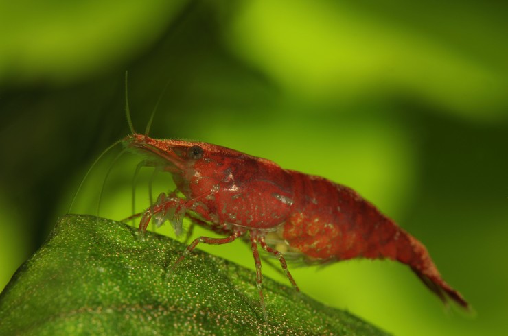 Креветка вишня – небольшое ракообразное, в длину вырастает до 2,5-4 см. Тело полупрозрачное, вытянутое, уплощенное с боков, включает два отдела – головогрудь и брюшко. На передних члениках брюшка расположены ножки. Головогрудь защищена панцирем, прикрывающим жаберные полости. Спинка креветки вишни обычно розовато-красного цвета, клешни и лапки покрыты небольшими светлыми пятнами, образующими характерный мраморный узор. Усы бывают белыми или розовыми.