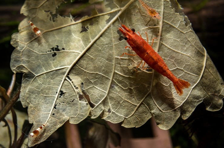 Иногда креветок черри подкармливают овощами, кусочками бананов, листьями салата и различных деревьев – дуба, орешника и т.п. В этом случае нужно тщательно следить за чистотой аквариума и убирать несъеденные остатки. Если черри живут в креветочнике, их необходимо кормить один раз в день таким количеством, чтобы весь корм был съеден не более чем за 2-3 часа.