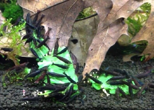 • Питание: Креветки всеядны. В их рацион входят сухие, растительные и замороженные корма, а также бланшированные овощи (огурцы, кабачки, листья салата). Также можно добавлять корма с содержанием кальция.