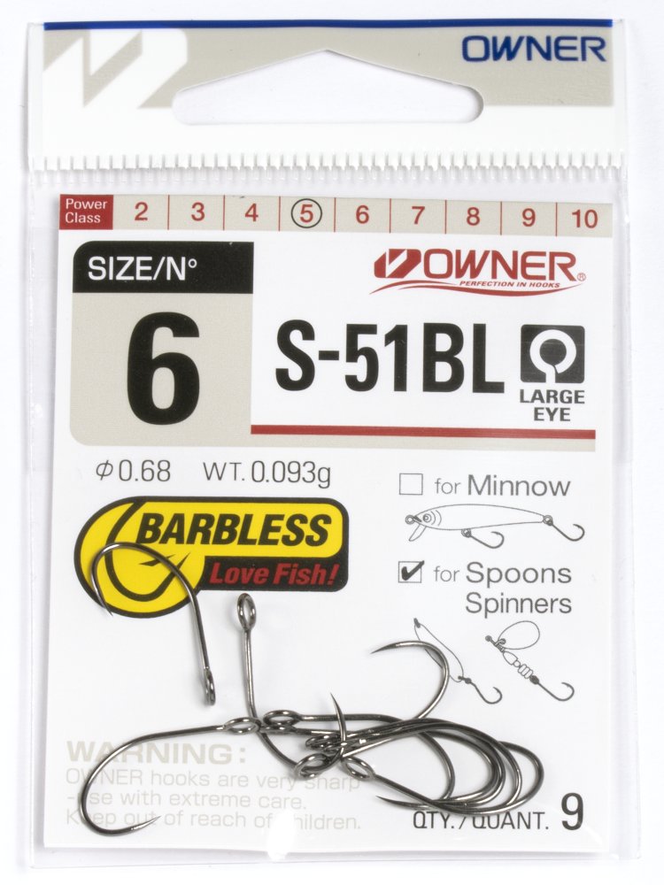 Серию крючков Owner 51627 (S-51BL) рекомендуется использовать при оснащении вращающихся и колеблющихся блесен. Крючки имеют полукруглый загиб, крепежное кольцо увеличенного диаметра и "безбородое" жало. В связи с последним крючки данной серии широко используются спортсменами, а также рыболовами, практикующими принцип "поймал-отпусти".
