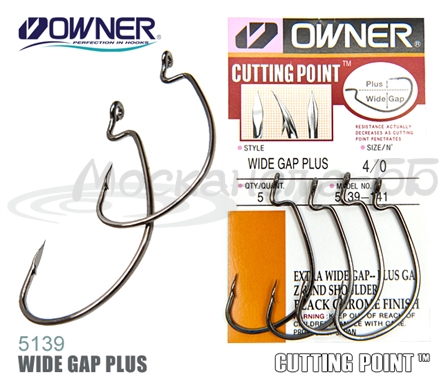 Интересным представителем офсетников от известной японской компании Owner являются крючки серии 5139 (Wide Gap Plus) . Крючки серии имеют увеличенный глубокий поддев и созданы специально для применения с массивными силиконовыми приманками. Покрытие крючков очень стойкое Black Chrome. Они изготовлены из толстой проволоки, которая лучше держится в пасти хищника, и имеют отличные режущие свойства благодаря качественной заточке (Cutting Point). В результате всего этого крючки эффективны при подсечке и имеют хорошую зацепистость. Жало крючков смотрит на ушко, но не на одном уровне, поэтому снижается вероятность потерять приманку, которая где-то застряла.Номер: 3/0Кол-во в упаковке: 5штТип крепления: колечкоПроизводитель: OWNER