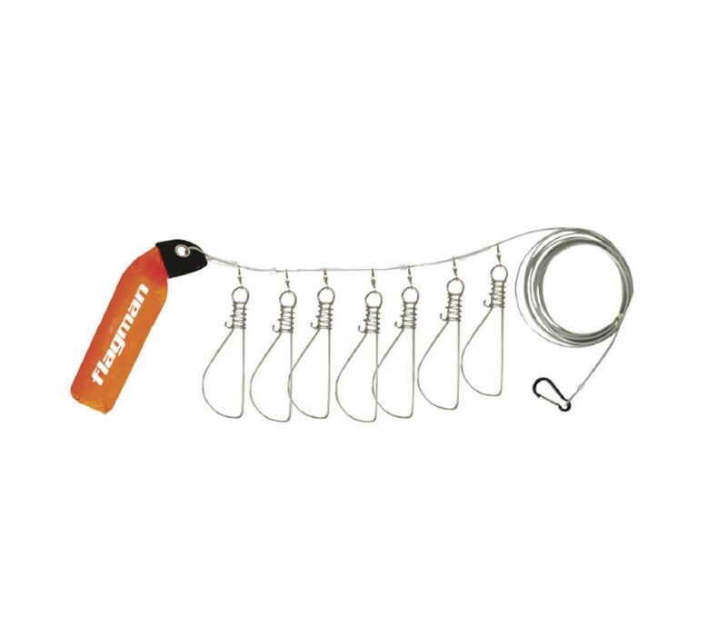 Набор мощных куканов с пружинными фиксаторами. Каждый кукан прикреплен к стальному тросу посредством вертлюга. Куканы свободно перемещаются по тросу, благодаря чему для закрепления очередного трофея не нужно извлекать из воды весь улов. На тросе с одной стороны присутствует карабин для крепления, а с другой – специальный поплавок. Поставляется в прозрачном непромокаемом чехле.