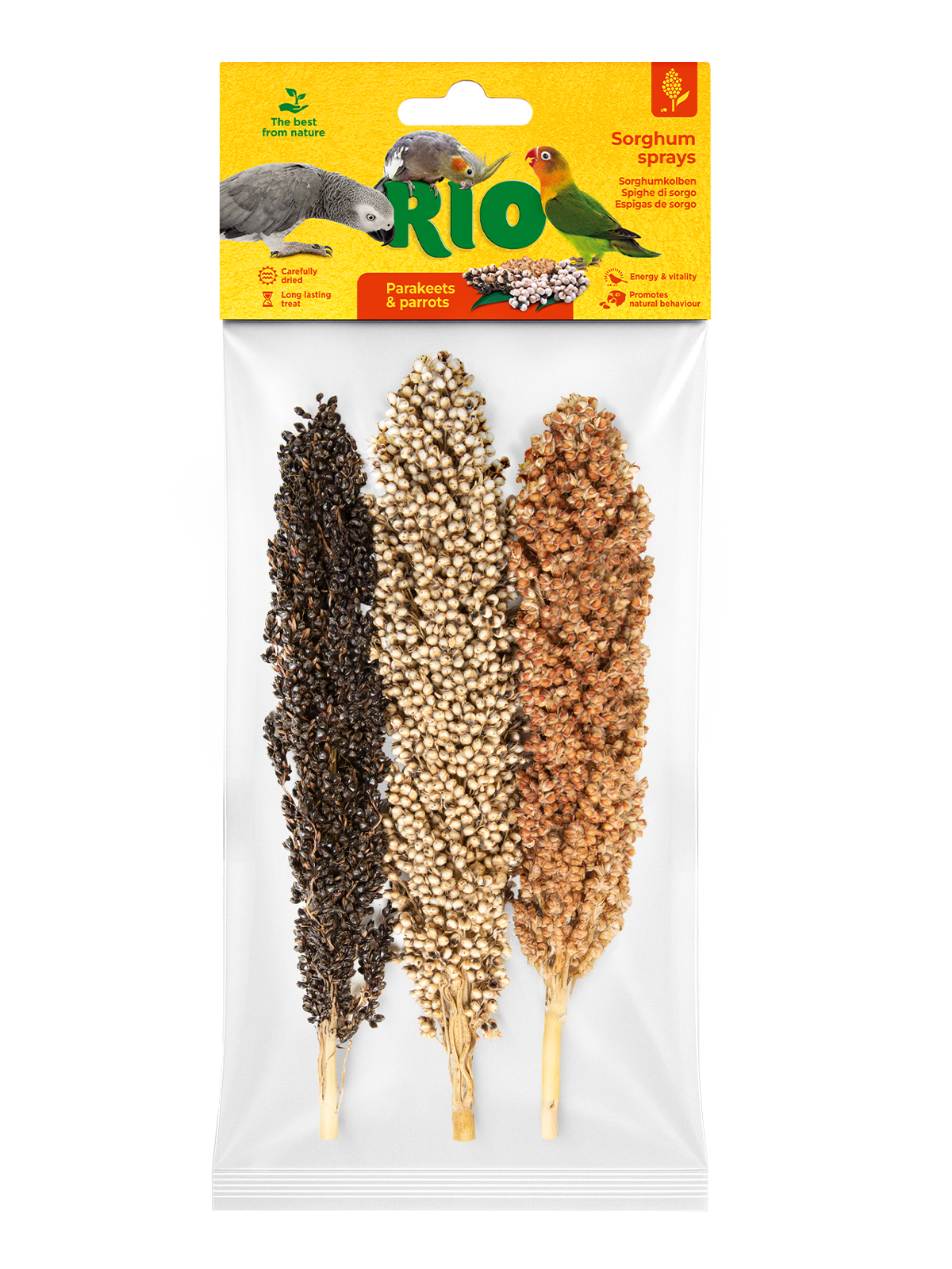 RIO Сорго в колосьях - природное и питательное лакомство для средних и крупных попугаев. Колоски стимулируют естественные инстинкты птиц, делая процесс кормления более интересным и увлекательным.