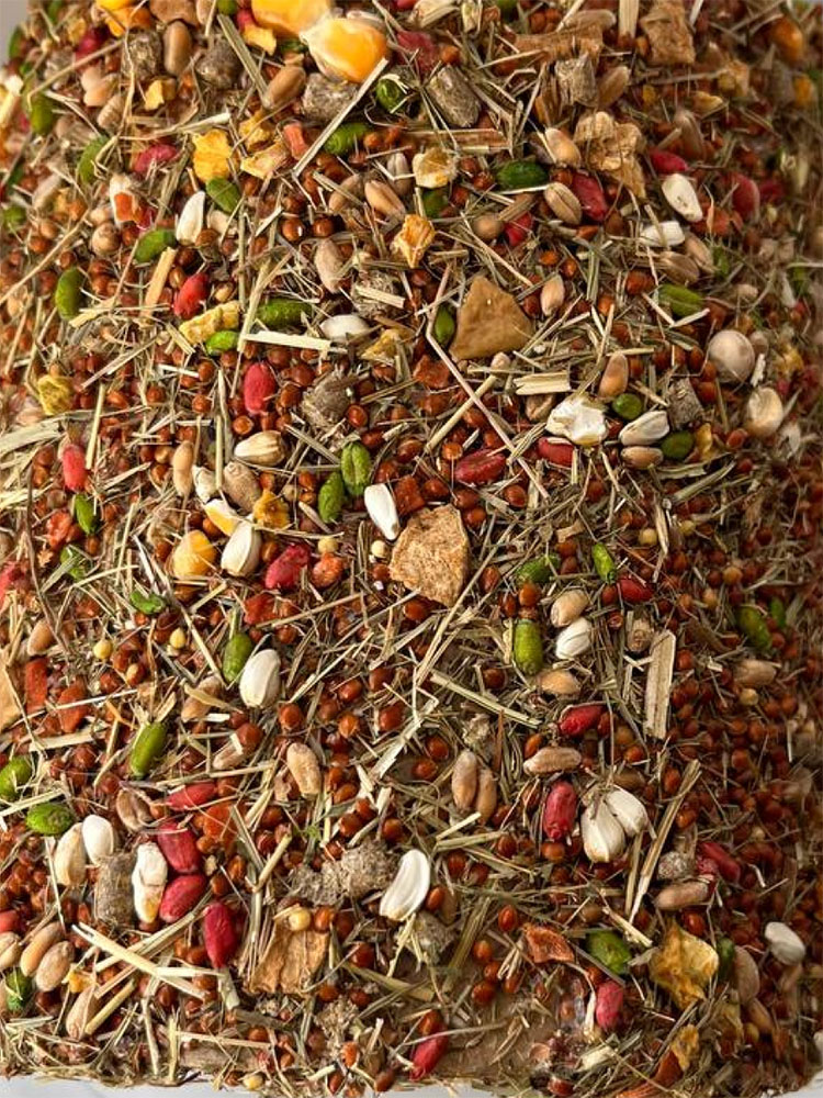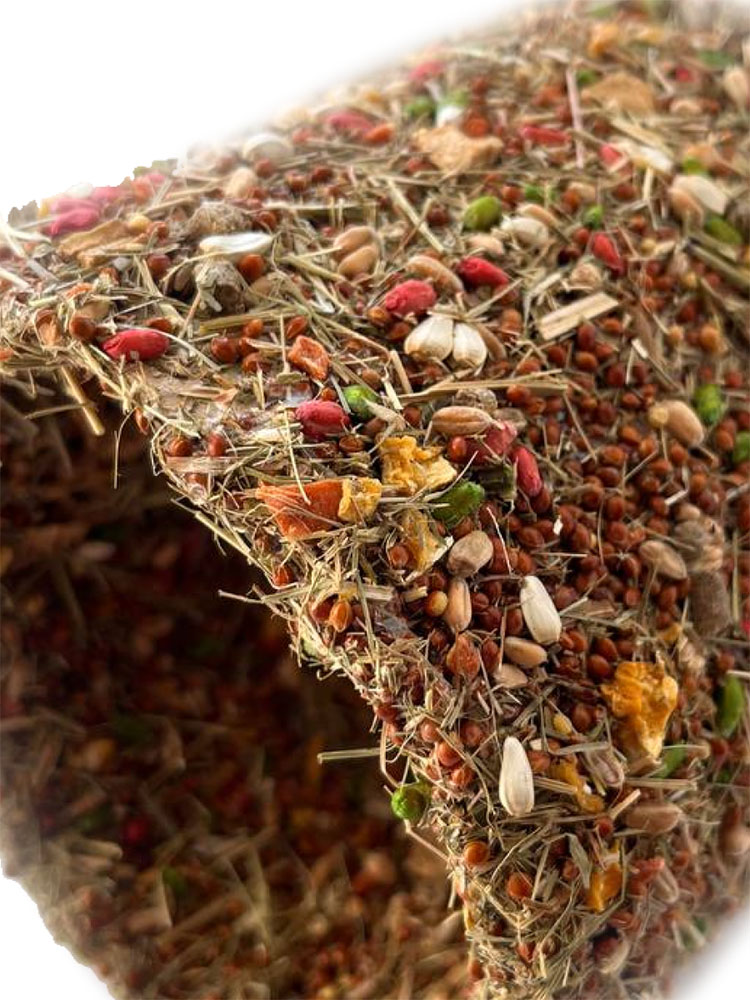 Состав: семена злаковых культур, травяная гранула, горох плющенный, просо, морковь, тыква, свекла, томат, перец сладкий, сафлор, лён, петрушка, сено луговое, основание – картонный ролл.