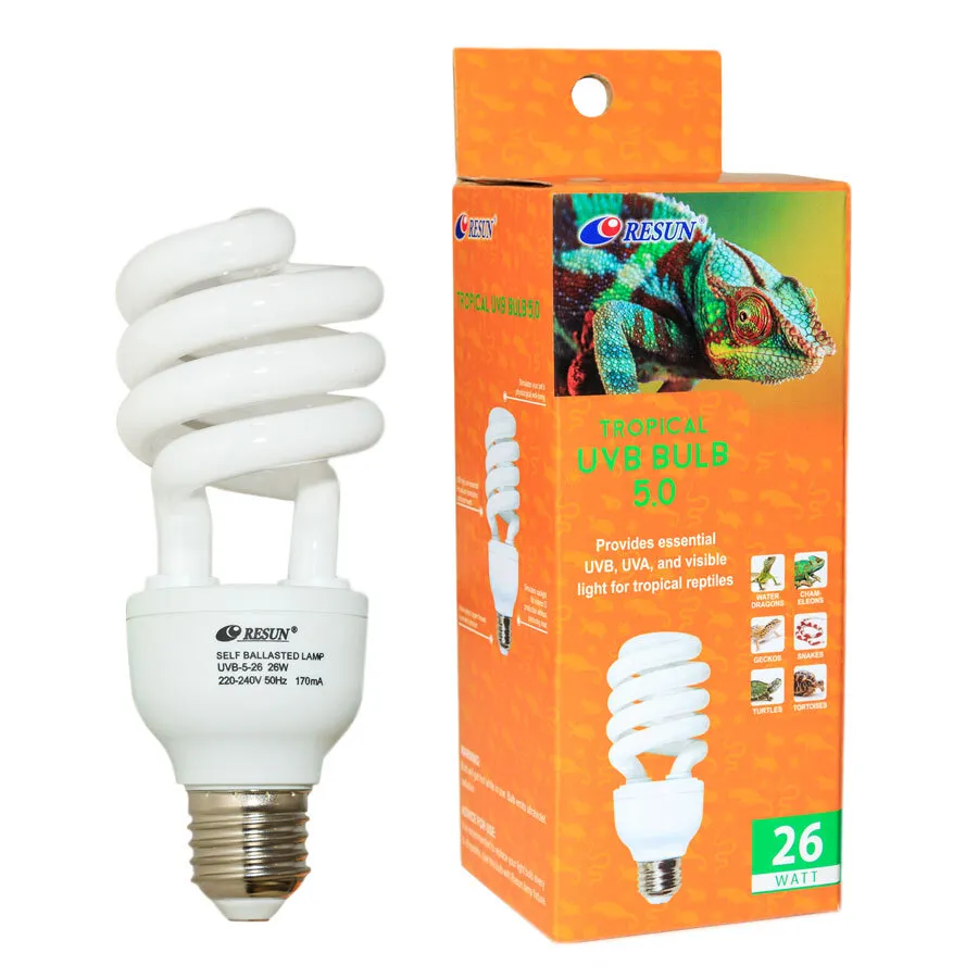 Ультрафиолетовая лампа RESUN UVB-10-26 для террариума со стандартным цоколем E27 подходит для большинства тропических и субтропических рептилий, в том числе для водных и сухопутных черепах.