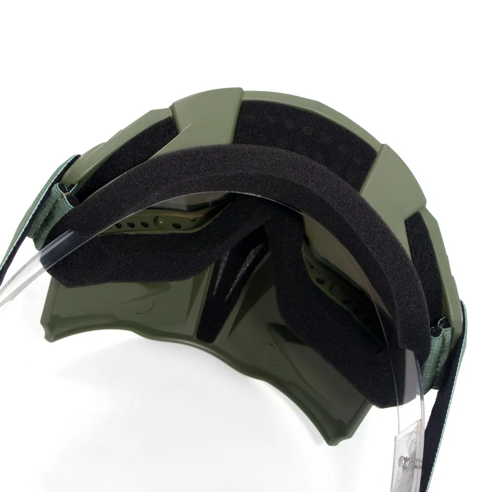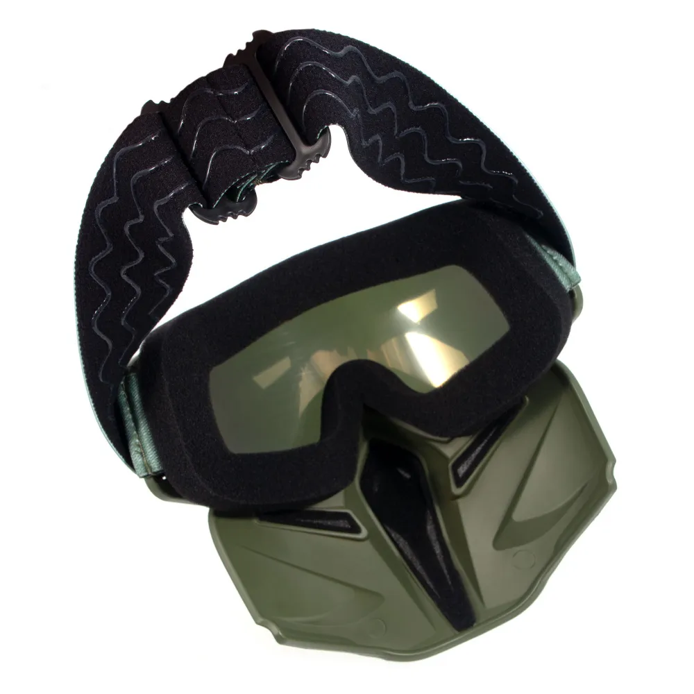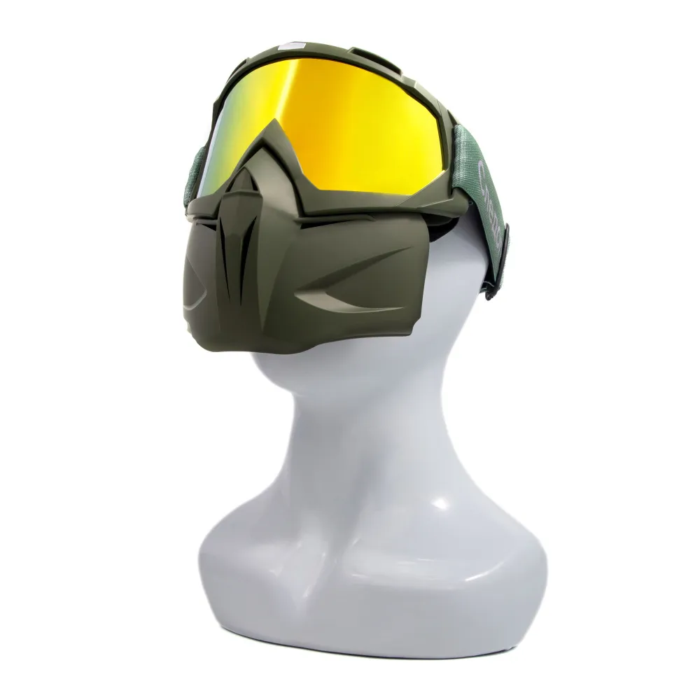 Маска состоит из двух частей, которые можно использовать как вместе, так и снять нижнюю часть и использовать только очки. В нижней части маски сделаны стильные воздухозаборники, а внутри вырезов размещена мелкая сетка для защиты органов дыхания от попадания инородных предметов при движении на скорости. Верхняя часть маски с внутренней стороны оснащена мягкой поролоновой накладкой для плотной и комфортной посадки на лице. А сверху маска вентилируется через систему отверстий, защищенных фильтром.