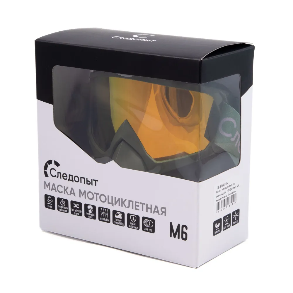 Маска является важной частью мотоэкипировки, а так же подходит для любого занятия активными видами спорта на открытом воздухе и зимой, и летом. Маска мотоциклетная/снегоходная СЛЕДОПЫТ M6 с линзой chrome chamelion для мотокросса не только защищает глаза от вредного воздействия солнечных лучей и ультрафиолетового излучения, но и обеспечивает дополнительную защиту от ветра, пыли, грязи и других неблагоприятных факторов окружающей среды.