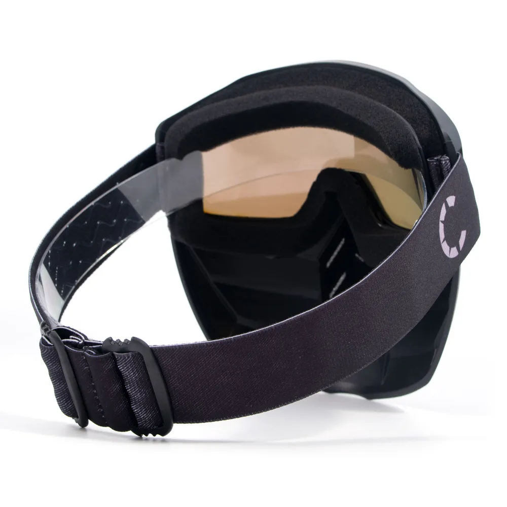 Маска состоит из двух частей, которые можно использовать как вместе, так и снять нижнюю часть и использовать только очки. В нижней части маски есть стильные воздухозаборники, с их внутренней стороны размещена мелкая сетка для защиты органов дыхания от попадания инородных предметов при движении на скорости. Верхняя часть маски с внутренней стороны оснащена мягкой поролоновой накладкой для плотной и комфортной посадки на лице. Сверху маска вентилируется через систему отверстий, защищенных фильтром.