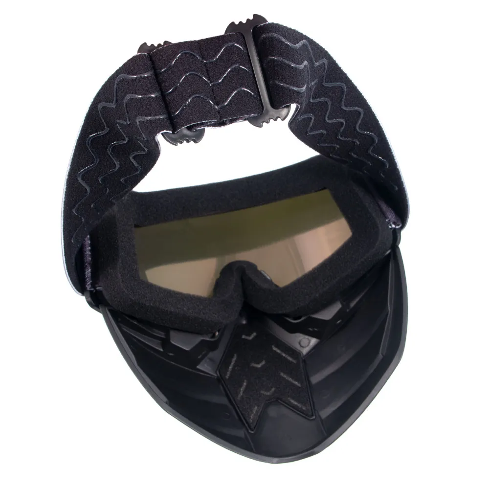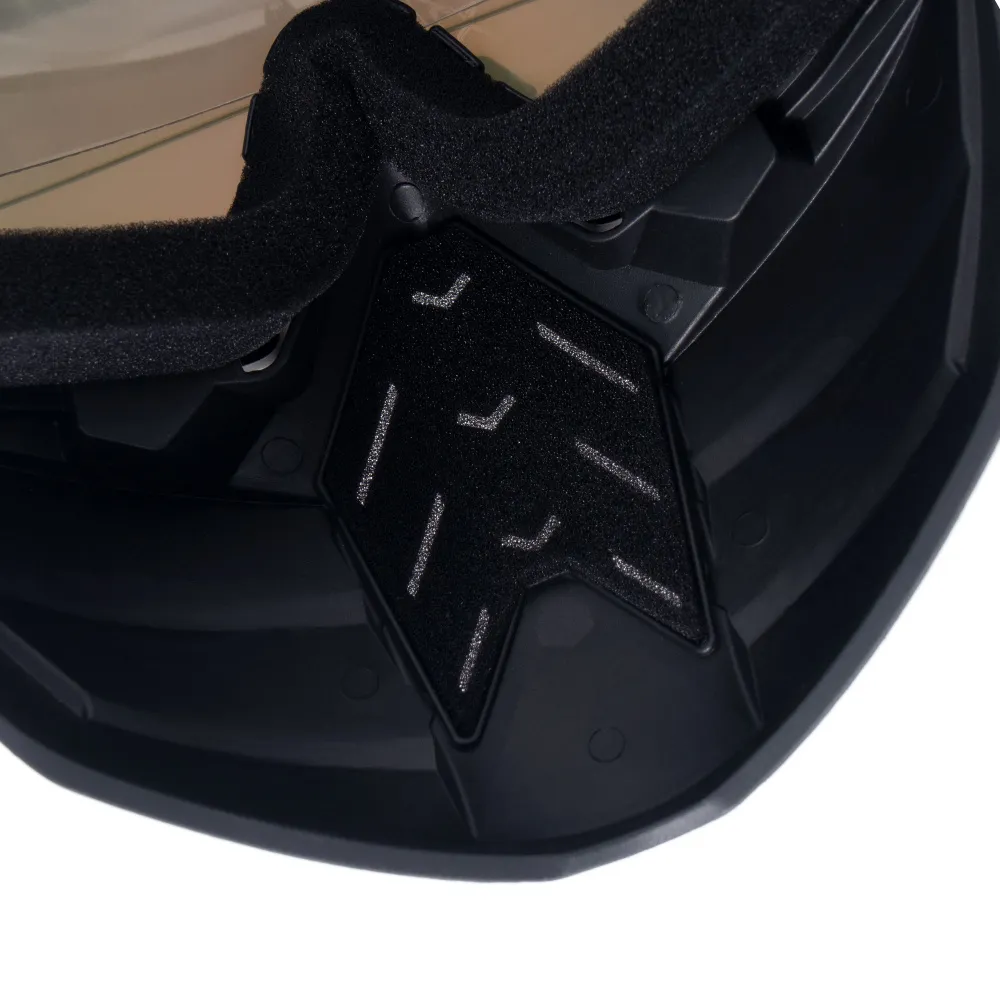 Маска состоит из двух частей, которые можно использовать как вместе, так и снять нижнюю часть и использовать только очки. В нижней части маски есть стильные воздухозаборники, с их внутренней стороны размещена мелкая сетка для защиты органов дыхания от попадания инородных предметов при движении на скорости. Верхняя часть маски с внутренней стороны оснащена мягкой поролоновой накладкой для плотной и комфортной посадки на лице. Сверху маска вентилируется через систему отверстий, защищенных фильтром.