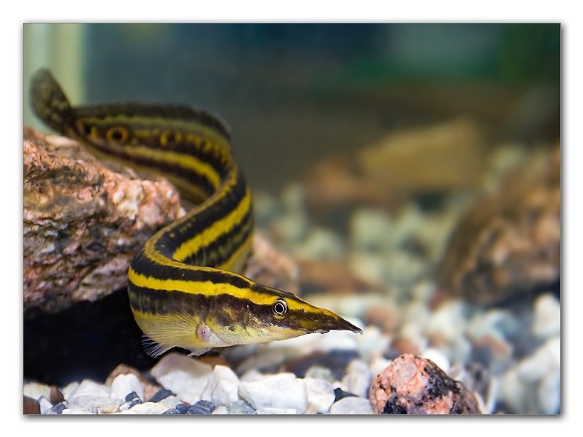 Тело мастацембела вытянутое, змееобразное с длинным хоботком. И спинной и анальный плавники вытянутые, соединены с хвостовым плавником. В природе он может вырастать до 90 см в длину, но в аквариуме обычно меньше, порядка 50 см. Живут мастацембелусы долго, 14-18 лет.Цвет тела коричневатый, с темными, иногда черными полосами и пятнами. Окраска каждой особи индивидуальна и может сильно отличаться.Содержание в аквариумеСамый важный параметр для них, это всегда чистая и хорошо аэрированная вода. Необходимы регулярные подмены воды, мощный внешний фильтр и течение.Всю свою жизнь мастацембел проводит на дне, редко поднимаясь в средние слои воды. Так что важно чтобы в грунте не было накоплено много продуктов распада - аммиака и нитратов. Со своей нежной чешуей и донным образом жизни, мастацембел первый кто от этого пострадает.Помните, что растет он очень немаленьким, и ему нужен просторный аквариум, для взрослой особи от 400 литров. При этом высота имеет малое значение, а ширина и длина большое. Нужен аквариум с большой площадью дна.Любят они полумрак, если в аквариуме песок или мелкий гравий, то будут зарываться в него. Для содержания мастацембела важно, чтобы в аквариуме было много укрытий, так как это ночная рыба и неактивная днем. Если ему будет негде спрятаться, то это приведет к постоянному стрессу и гибели. Кроме того, важно чтобы аквариум был плотно накрыт, так как мастацембелус может выбраться даже сквозь небольшую щель и погибнуть.Оптимальные параметры водыТемпература воды: 23-28 °CКислотность воды: 6,5-7,5 рНЖесткость воды: 5-15 dH.КормлениеВ природе мастацембел всеядный. Питается он ночью, в основном различными насекомыми, но может и растительной пищей. Как и все угри, он предпочитает есть животные корма - мотыль, трубочник, мясо креветки, земляных червей и т.д.Некоторых мастацембелов можно приучить к замороженным кормам, но в основном они едят их неохотно. Также они с легкостью съедят рыбку, которую смогут проглотить. Совместимость с другими рыбамиНочные жители, в основном мирные и робкие. Однако, мелкую рыбу они обязательно съедят, а остальную проигнорируют. Кроме того, они могут быть достаточно агрессивны к родственникам и в основном содержат только одного мастацембела на аквариум. Да и размер редко позволяет содержать пару, нужно очень большой аквариум с множеством укрытий.