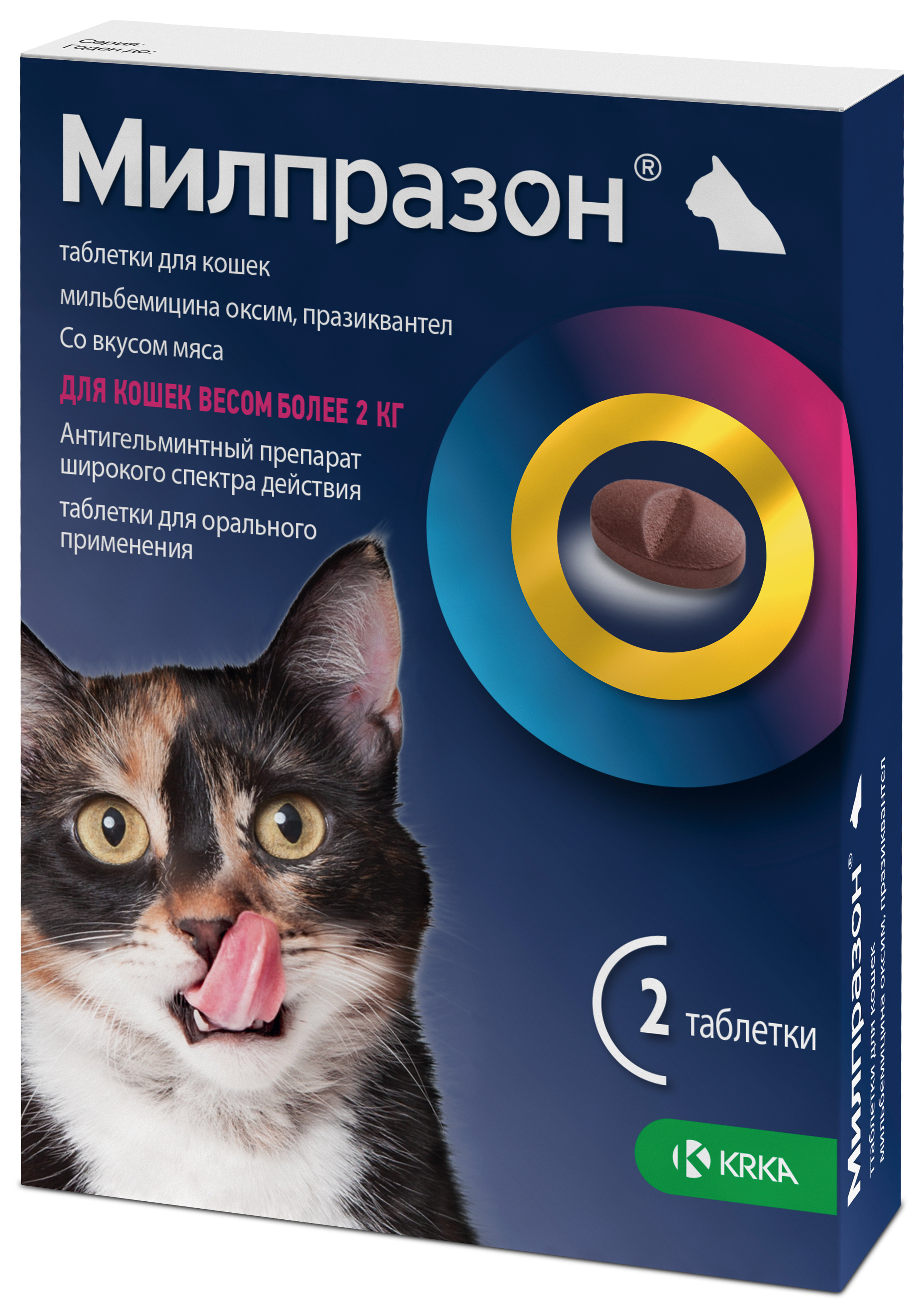 Состав: Милпразон выпускают препарат в модификации для котят и кошек весом до 2 кг с содержанием действующих веществ: мильбемицина оксим 4 мг и празиквантела 10 мг в одной таблетке. В качестве вспомогательных веществ в таблетках этой модификации содержится: микрокристаллическая целлюлоза, моногидрат лактозы, повидон, кроскармеллоза натрия, кремний коллоидный безводный, магния стеарат, опадрай белый, мясной ароматизатор (Aroma Meat Flavour 10022), сухие дрожжи, железа оксид желтый. В модификации препарата для кошек весом более 2 кг содержится в качестве действующих веществ: мильбемицина оксим 16 мг и празиквантел 40 мг в одной таблетке. В качестве вспомогательных веществ в таблетках этой модификации содержится: микрокристаллическая целлюлоза, моногидрат лактозы, повидон, кроскармеллоза натрия, кремний коллоидный безводный, магния стеарат, опадрай белый, мясной ароматизатор (Aroma Meat Flavour 10022), сухие дрожжи, железа оксид красный. По внешнему виду Милпразон таблетки для кошек в модификации для котят и кошек весом до 2 кг представляют собой коричнево-желтые овальные двояковыпуклые таблетки со вкусом мяса, покрытые пленочной оболочкой, с риской на одной стороне; а в модификации для кошек весом более 2 кг - коричнево-красные овальные двояковыпуклые таблетки со вкусом мяса, покрытые пленочной оболочкой, с риской на одной стороне.