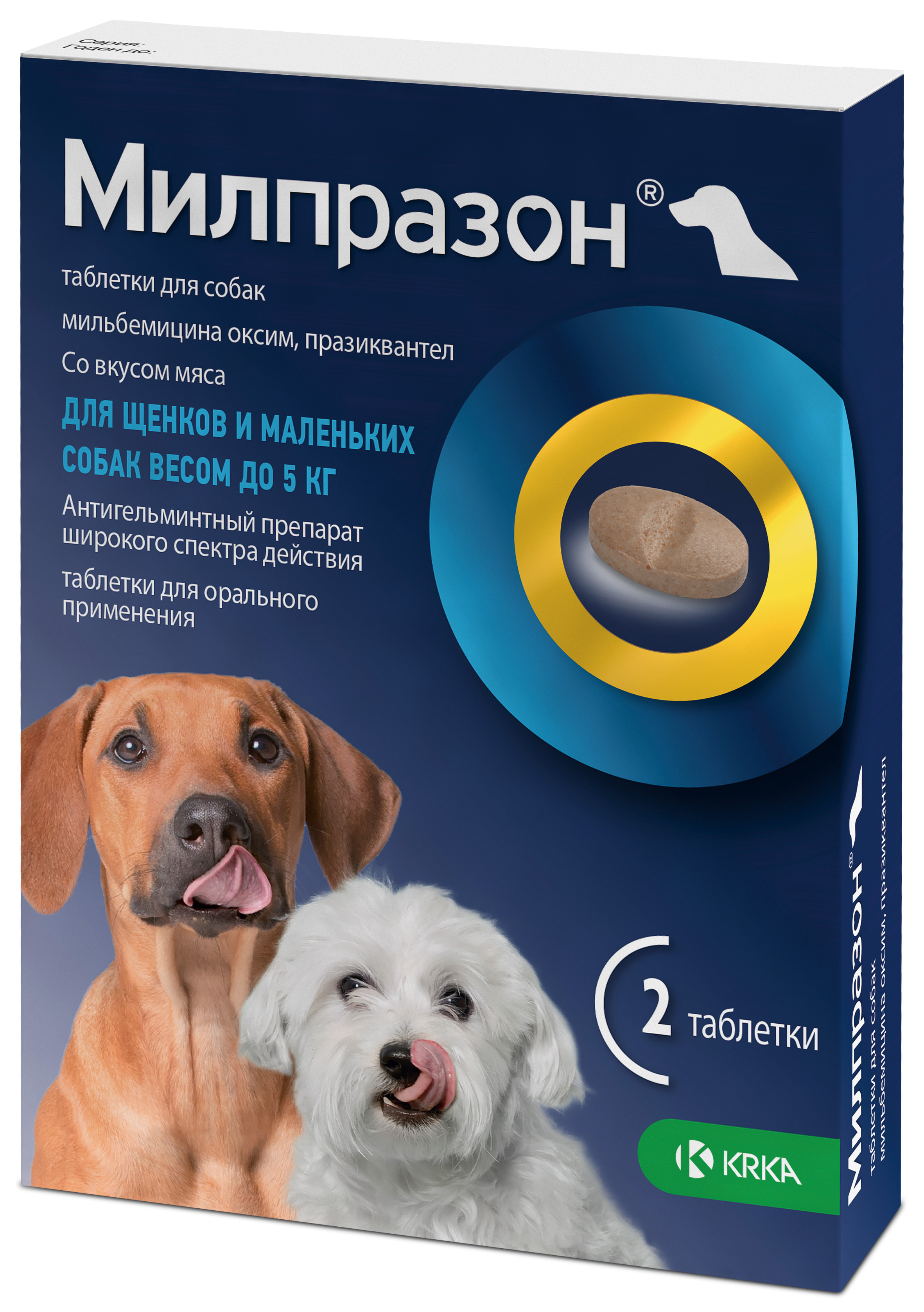 Состав: Милпразон таблетки для собак выпускают препарат в двух модификациях: для щенков и маленьких собак весом до 5 кг, содержащей в 1 таблетке в качестве действующих веществ: мильбемицина оксим - 2,5 мг и празиквантел - 25 мг; и для собак весом более 5 кг, содержащей в 1 таблетке в качестве действующих веществ: мильбемицина оксим - 12,5 мг и празиквантел - 125 мг. В качестве вспомогательных веществ препарат содержит микрокристаллическую целлюлозу, моногидрат лактозы, повидон, натрий кроскармеллозу, кремний коллоидный безводный, магния стеарат, мясной ароматизатор (Aroma Meat Flavour 10022), сухие дрожжи. По внешнему виду Милпразон таблетки для собак в модификации для щенков и маленьких собак весом до 5 кг представляют собой овальные, двояковыпуклые таблетки со вкусом мяса желтовато-белого цвета с коричневыми вкраплениями и риской на одной стороне; а в модификации для собак весом более 5 кг - круглые, двояковыпуклые таблетки со вкусом мяса желтовато-белого цвета с коричневыми вкраплениями. Неиспользованную половину таблетки в модификации препарата для щенков и маленьких собак весом до 5 кг можно поместить в блистер и хранить до следующей дегельминтизации, но не более 6 месяцев после вскрытия упаковки.