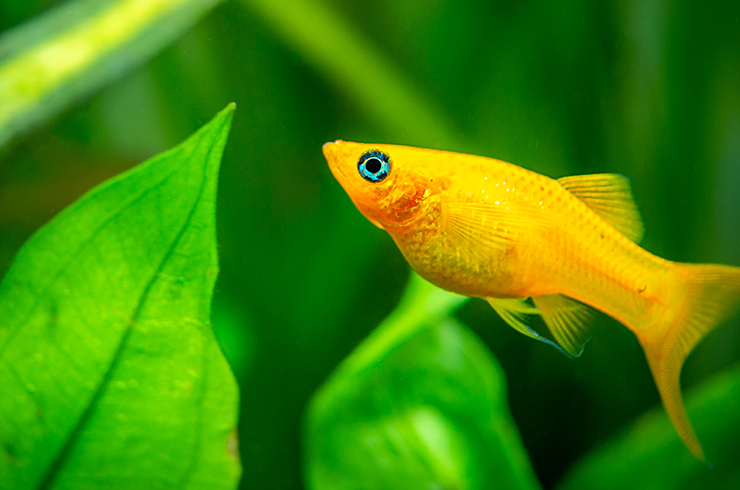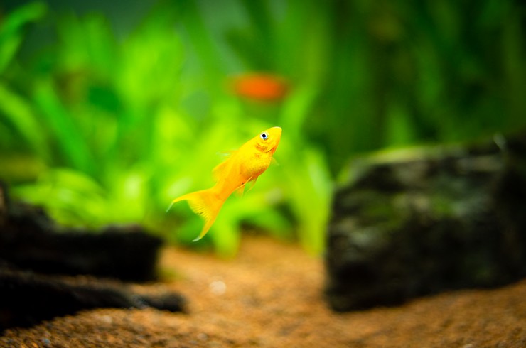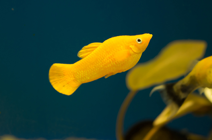 Желтые моллинезии хорошо совместимы с живыми растениями, поэтому обязательно создайте островки зелени из валлиснерии, криптокарин, эхинодорусов, бакопы. Иногда моллинезии подъедают нежные листья у некоторых растений, но если в рацион включить корма со спирулиной, то делают они это гораздо реже. Полезно завести в аквариум роголистник, оставив его плавать на поверхности воды – он станет отличным укрытием для мальков, когда они появятся.
