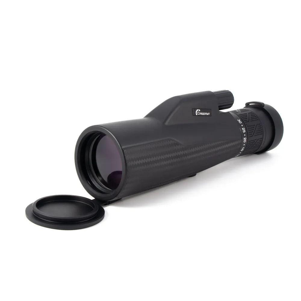 Увеличенный по размеру окуляр, линза которого состоит из двух оптических элементов в одном блоке, обеспечивает дополнительный комфорт для людей, пользующихся очками при наблюдении. Увеличенный наглазник окуляра позволит без проблем пользоваться прибором при боковом расположении солнца к монокуляру в ясную погоду и избежать светорассеивания и бликов в оптической системе.