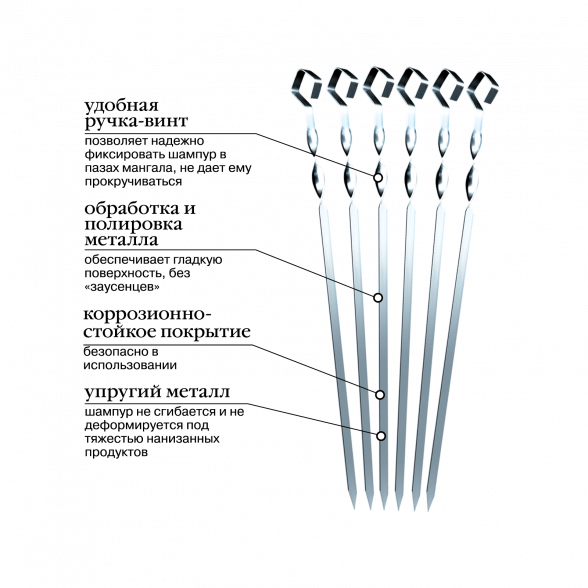 Набор больших шампуров в чехле Forester Mobile RZ-550M идеальный аксессуар для пикников, поскольку длина каждого шампура 55 см позволяет использовать его на мангале практически любой ширины. Изделия выполнены из никелированной стали, что обеспечивает им стойкость к коррозии и длительный эксплуатационный срок. Упругий материал хорошо выдерживает вес крупных кусков пищи, не деформируясь и не выгибаясь даже под воздействием высокой температуры.