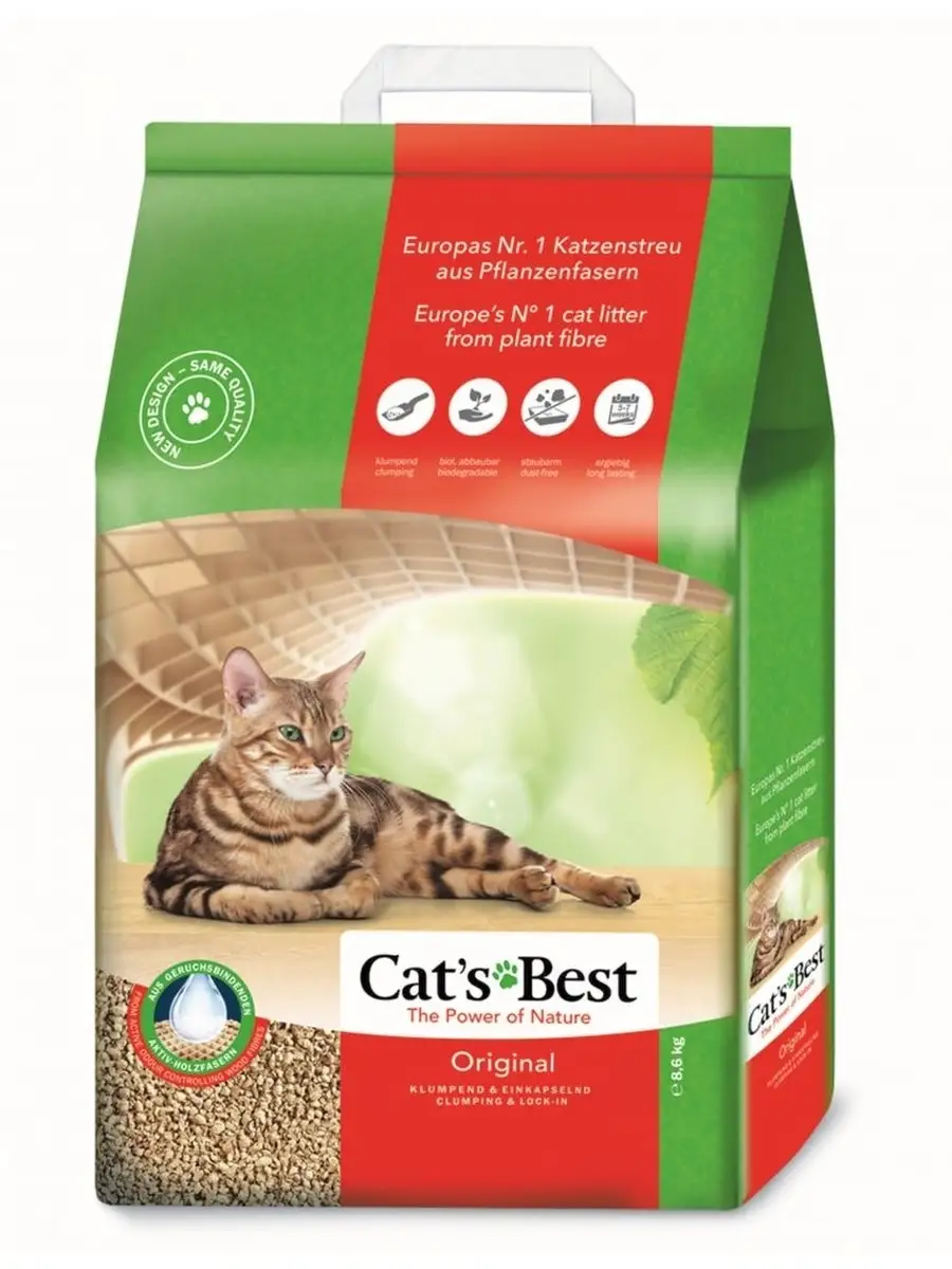 • Cat's Best  состоит из органических волокон, поэтому отлично связывает влагу и поглощает неприятные запахи.