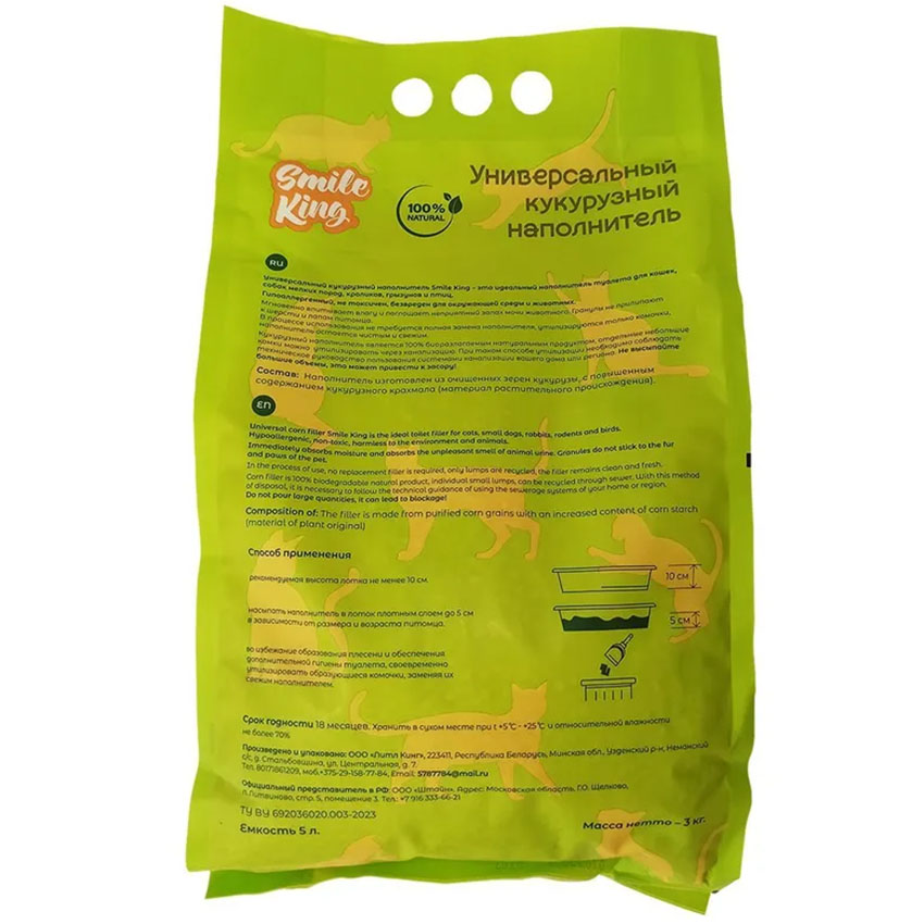 Кукурузный наполнитель для грызунов, кошек и котов, собак мелких пород Smile King 3 кг комкующийся - гипоаллергенный, не токсичен, безвреден для окружающей среды и животных. Мгновенно впитывает влагу и поглощает неприятный запах. Гранулы не прилипают к шерсти и лапам питомца. Не требуется полная замена наполнителя ULITTER 2KG.
