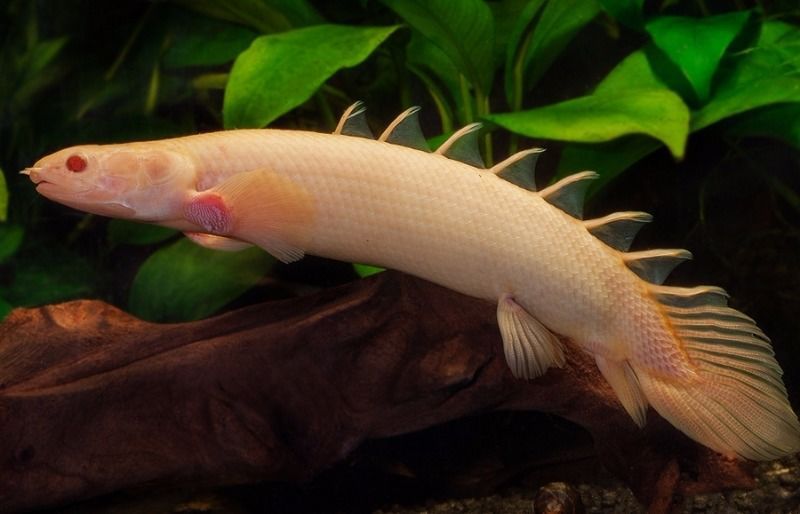 Полиптерус сенегальский альбинос (Polypterus senegalus var. albino) — это уникальная пресноводная рыба, известная как "живое ископаемое" из-за своего примитивного вида. Это выносливый и интересный питомец, который может прожить в неволе до 10 лет.