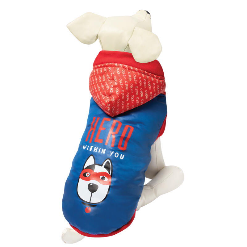Утепленная попона "Мой герой" с капюшоном для комфортных прогулок даже в самую ненастную погоду. Попона украшена оригинальным принтом на спине. Застегивается при помощи трех заклепок на животе. Подкладка: плюш.