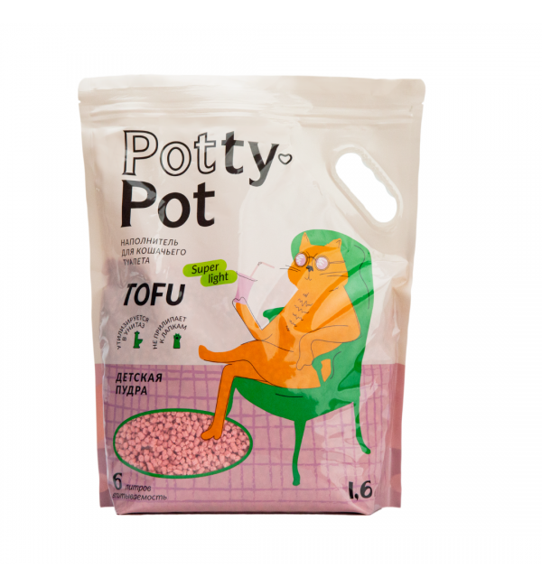 Растительный наполнитель Потти-Пот Супер лайт Детская пудра  премиум-класса -  это комкующийся наполнитель для кошачьего туалета, изготовленный из пищевых соевых волокон, которые проходят высокотемпературную сушку и дезинфекцию. Соевые волокна смешанные с натуральным экстрактом гуаровых бобов поглощают воду и контролируют запах. Это экологически чистый продукт, который вы можете безопасно использовать, поскольку сформированные комочки не загрязняют воду и почву при утилизации.
