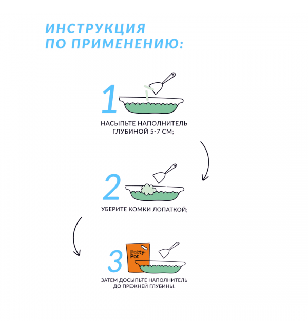 Отличительной особенностью наполнителя Potty-Pot являются премиальные гранулы диаметром 3 мм, обладающие способностью образовывать сверхпрочные комки при соприкосновении с жидкостью, которые впоследствии легко утилизируются в унитаз. Рекомендуется смывать в унитаз не более 2-3 комков за один раз.
